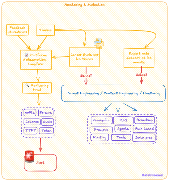 Ça peut commencer simplement : un joli dataset d'évaluation qu'on enrichit petit à petit. Des humains annotent, on accumule. Et progressivement, on fait en sorte que l'agent lui-même note et évalue ses traces, en se basant sur les feedbacks humains précédents.